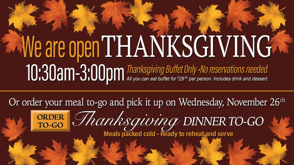 Roasted Turkey, Ham, Broasted Chicken, Dressing, Noodles, Green Beans, Mashed Potatoes with Gravy, Sweet Potatoes, Dinner Roll, Salad Bar, Beverage, and your choice of a slice of Apple Pie, Pumpkin Pie or Pumpkin Roll.